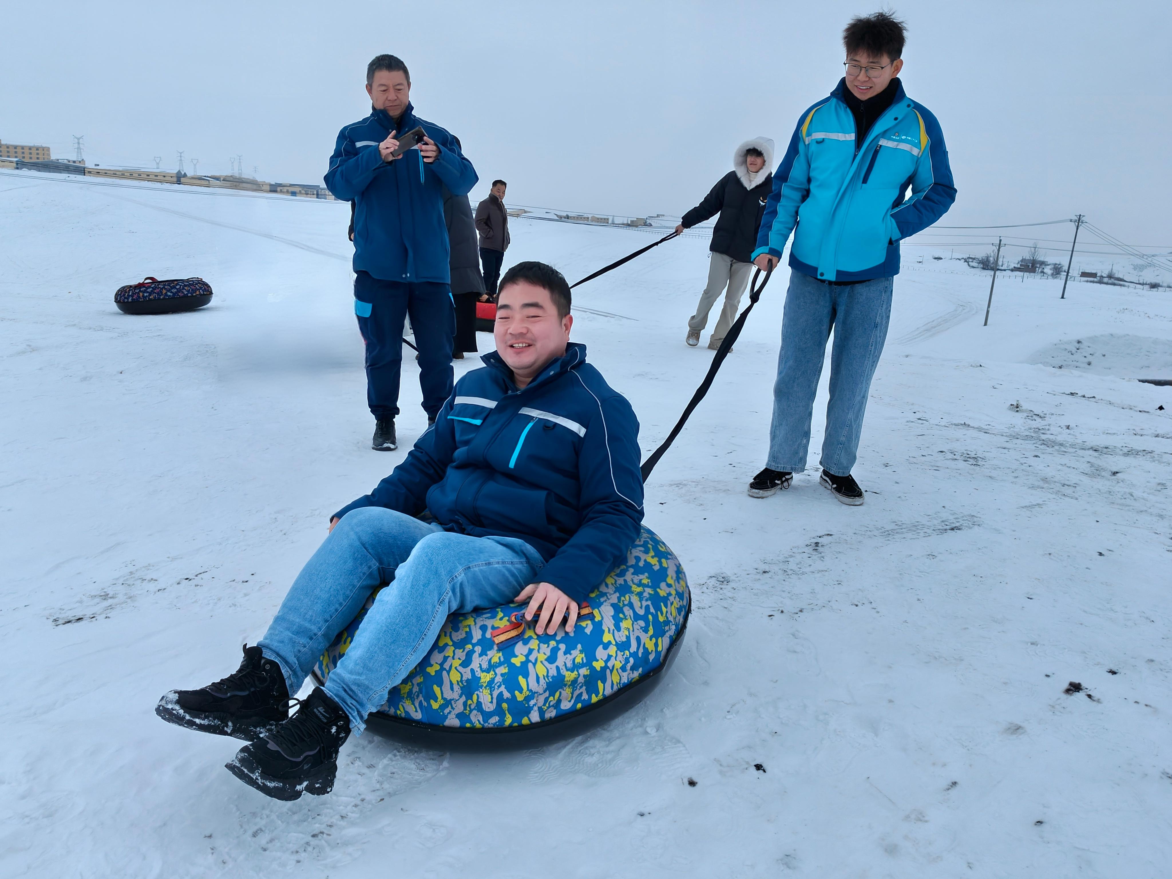 活動現(xiàn)場氣氛熱烈,職工們活力滿滿。大家雙手抓緊滑雪圈拉繩,發(fā)力向前滑行,雪圈在雪地上劃出一道道痕跡。眾人在滑行過程中互相配合,彼此照應,共同享受滑雪帶來的樂趣,現(xiàn)場不時傳來陣陣歡聲笑語。