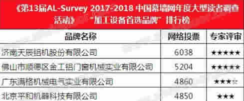 “天辰股份”憑借其雄厚的技術實力和品牌影響力,最終贏得廣大終端客戶、行業(yè)專家、設計院、顧問公司和媒體總編的高度認可,在第13屆AL-Survey2017-2018中國門窗幕墻行業(yè)大型讀者調查暨“我最喜愛品牌”評選活動中,成功衛(wèi)冕“加工設備首選品牌”大獎!