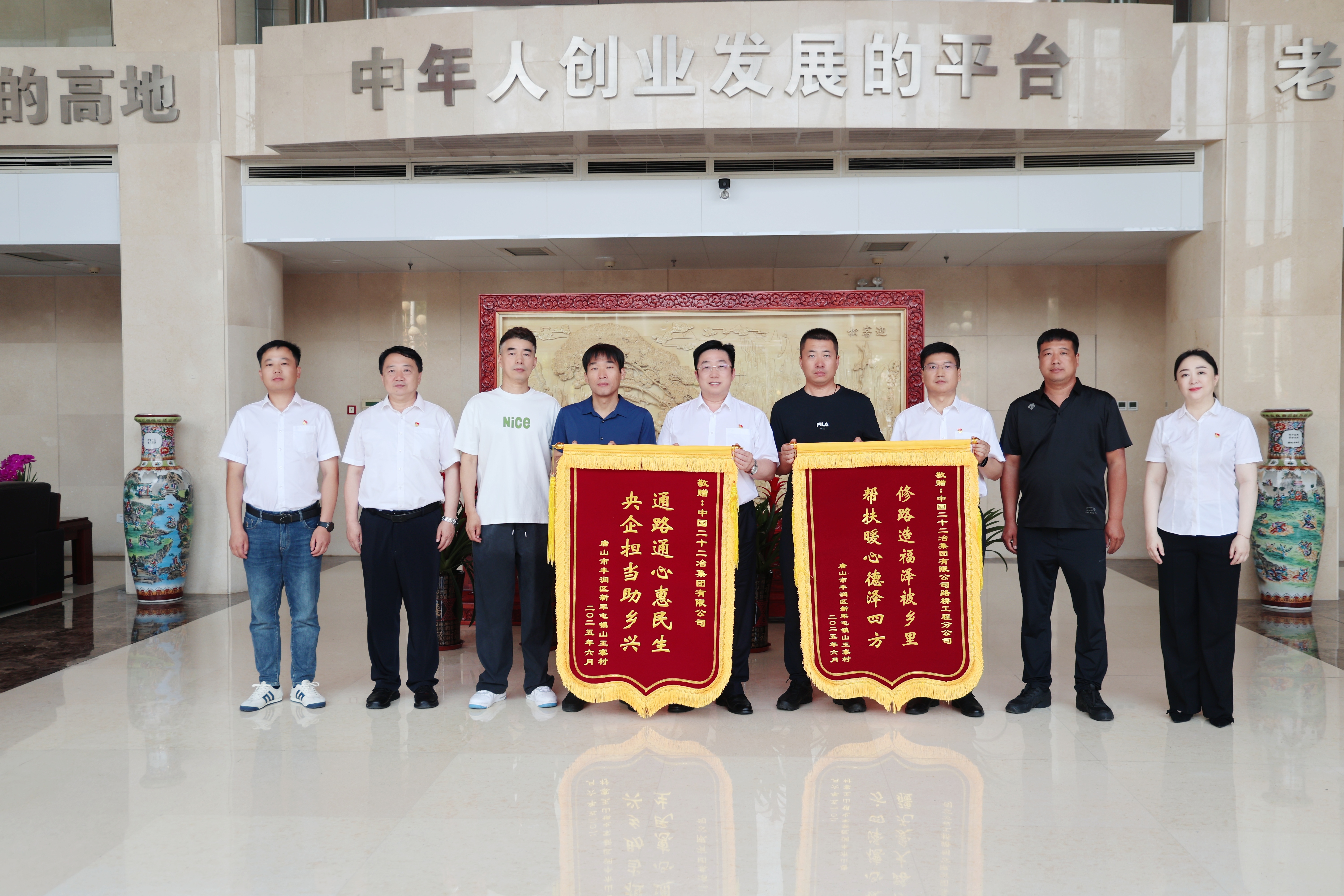 6月18日,唐山市總工會(huì)副主席付競(jìng)楠一行來到中國(guó)二十二冶辦公大樓,將寫著“通路通心惠民生 央企擔(dān)當(dāng)助鄉(xiāng)興”和“修路造福澤被鄉(xiāng)里 幫扶暖心德澤四方”的兩面錦旗送到了公司領(lǐng)導(dǎo)手中,表達(dá)對(duì)中國(guó)二十二冶路橋分公司傾力幫扶的深深謝意。